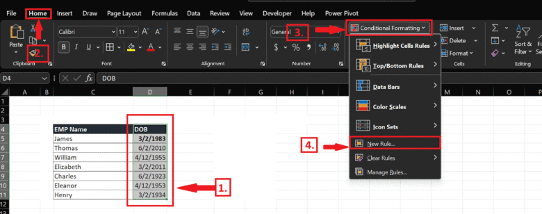 When analyzing age data in Excel, applying conditional formatting helps quickly identify age groups. These rules use Excel formulas to visually categorize records based on age limits. This section covers how to calculate age by date of birth in Excel and how to apply logic to highlight age groups or calculate the aging days in Excel.